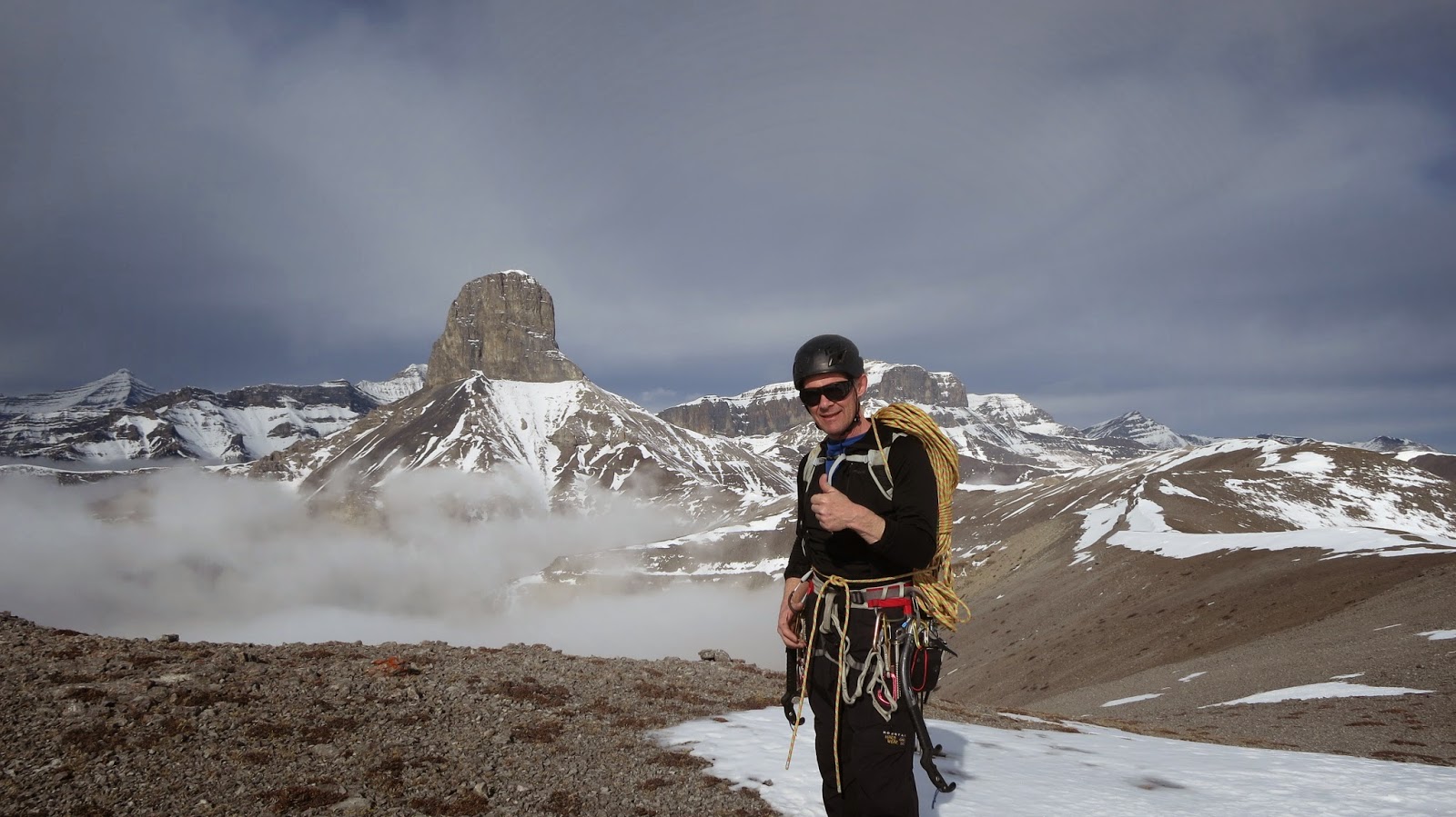 Dave led out through a small shale step, loose and not secure but that didn't slow him down at all. Then back right to a low spot in the cornice. He hacked his way through, up and over to the top. Apparently it was windy up there he said. I pulled the anchor, and was belayed up off his hip to the top where I quickly learned of this wind he was talking about...We both put on every layer we brought with, stayed roped up, quickly snapped a picture each and headed for the west ridge descent.